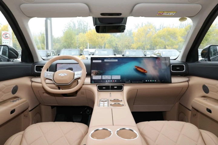 风云T11的车内布局显得格外精致,中控台前方两侧,是对称式空调出风口,旁边是多功能皮质方向盘,除入门款外,还增加了对北方用户友好的方向盘加热功能,冬天也能有温暖的握感。方向盘前方是10.25英寸的彩色全液晶仪表盘,而30英寸的中控屏,分辨率有6K,画面十分高清,内置高通骁龙8255芯片,具备5G网络、语音识别、应用下载等功能,而17.3英寸的副驾娱乐屏(入门款除外)的加入,进一步丰富了副驾女主人的娱乐生活。其次,车内还配备了50W手机无线充电面板、256色氛围灯等配置,顶配车型更是增加了冷热均可的车载冰箱,冰镇饮料、食品保鲜都可以。
